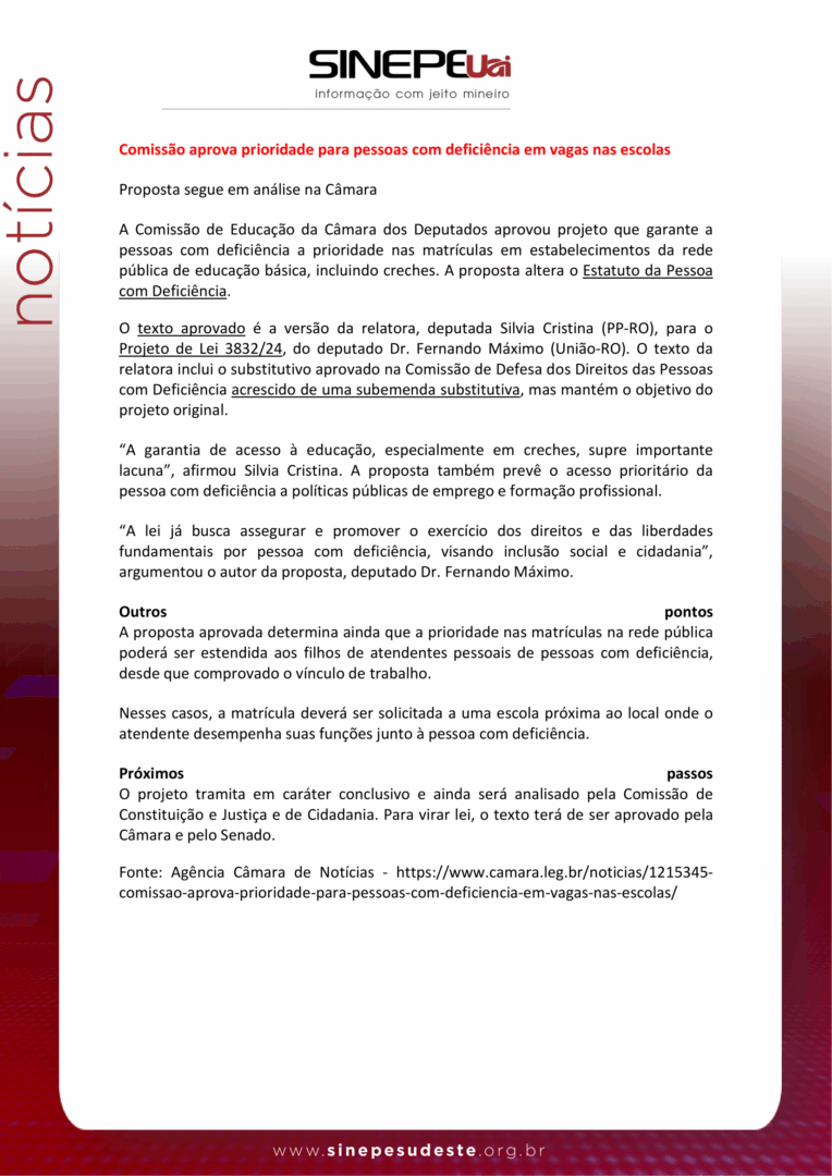 Sinepe Sudeste Notícias – Comissão aprova prioridade para pessoas com deficiência em vagas nas escolas por Sinepe/Sudeste 24 de outubro de 2025 Comunicados, Ensino 0