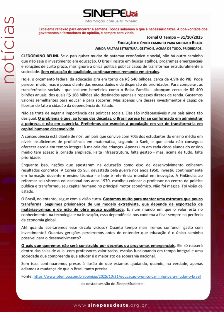 SINOT – Educação unico caminho para mudar o Brasil por Sinepe/Sudeste 31 de outubro de 2025 Comunicados, Ensino 0